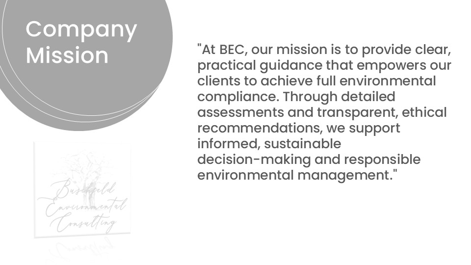 Buschfeld Environmental Consulting (BEC) is committed to helping organizations confidently meet their environmental compliance obligations. With over 16 years of specialized experience, we provide practical and reliable support tailored to your needs.